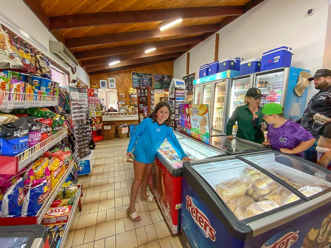 As you drive into the campground, the first thing you will see is the reception area, the cafe, the convenience store, and the bottle shop. Everything you could possibly need is here. You can purchase fuel, ice, gas bottle refills, basic groceries, and even alcohol too.